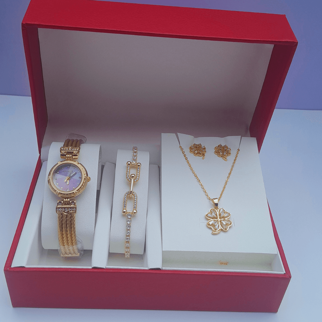 What distinguishes this 3-in-1 Ladies Gold Jewelry Set Classic as truly exceptional is the masterful harmony achieved between each carefully selected piece. The accompanying gold bracelet mirrors the same design philosophy and quality standards as the watch, creating seamless visual continuity that enhances your overall sophisticated appearance.