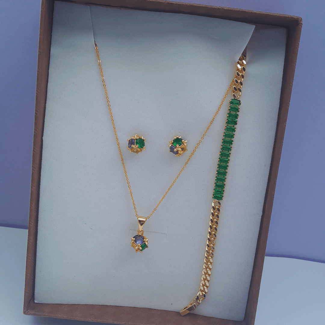 The 3-in-1 Ladies Jewelry Set in gold with green accents is designed for women who love elegance and sophistication. This set includes a necklace, bracelet, and earrings, all designed to complement each other for a polished, luxurious appearance. The gold finish reflects timeless style, while the subtle green accents add a fresh, vibrant touch.