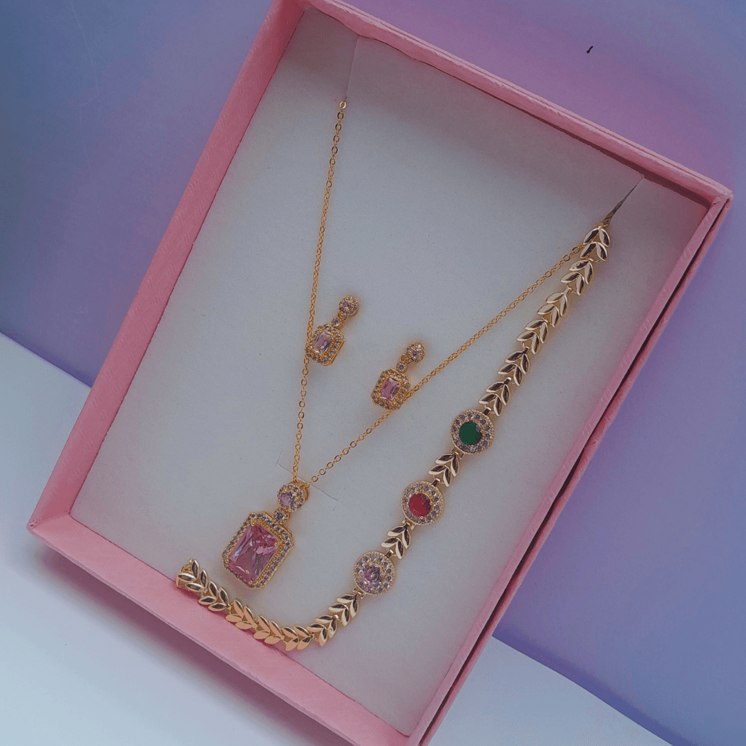 The 3-in-1 Ladies Jewelry Set is a perfect combination of sophistication, elegance, and luxury for modern women. Designed with meticulous attention to detail, this set includes a matching necklace, bracelet, and earrings in gold with delicate pink accents. Each piece of the set complements the others beautifully, making it ideal for formal events, casual gatherings, or as a statement accessory.