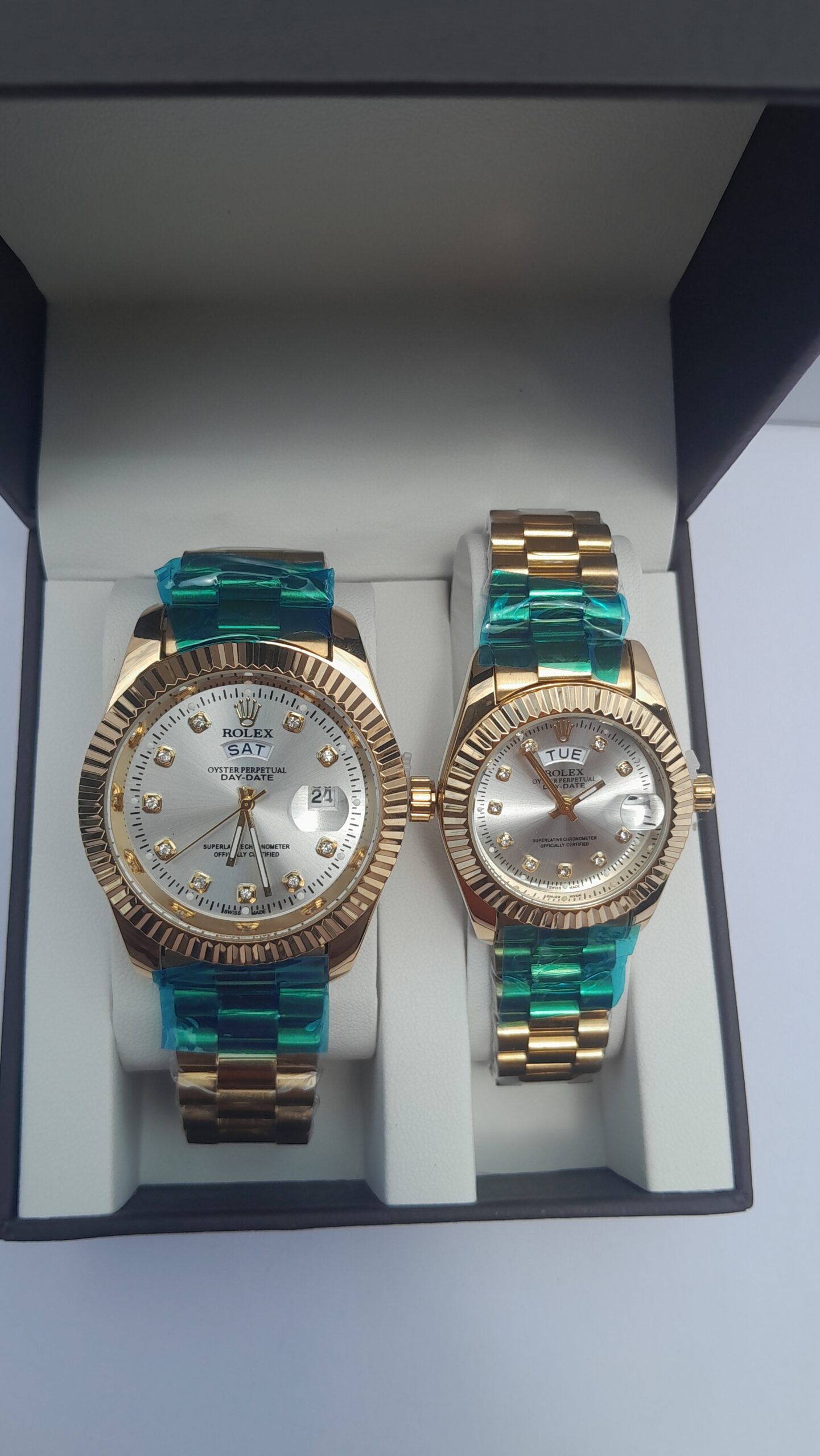 Perfect for couples in Ghana who want to express their bond through coordinated luxury accessories, this set offers both partners the opportunity to wear matching timepieces that reflect their shared taste and commitment. The rich gold color creates a warm, luxurious appearance that suits both masculine and feminine aesthetics.