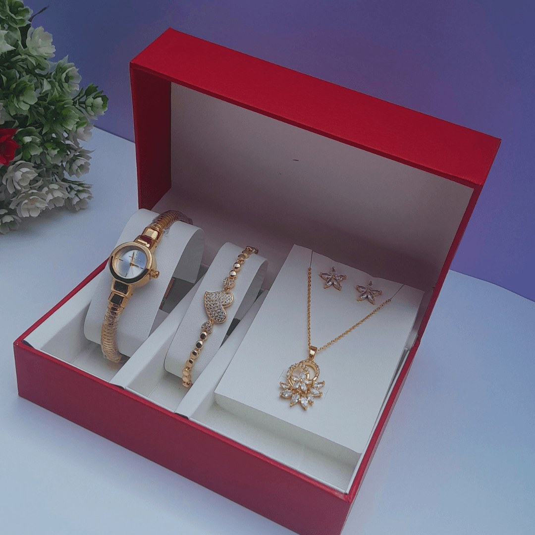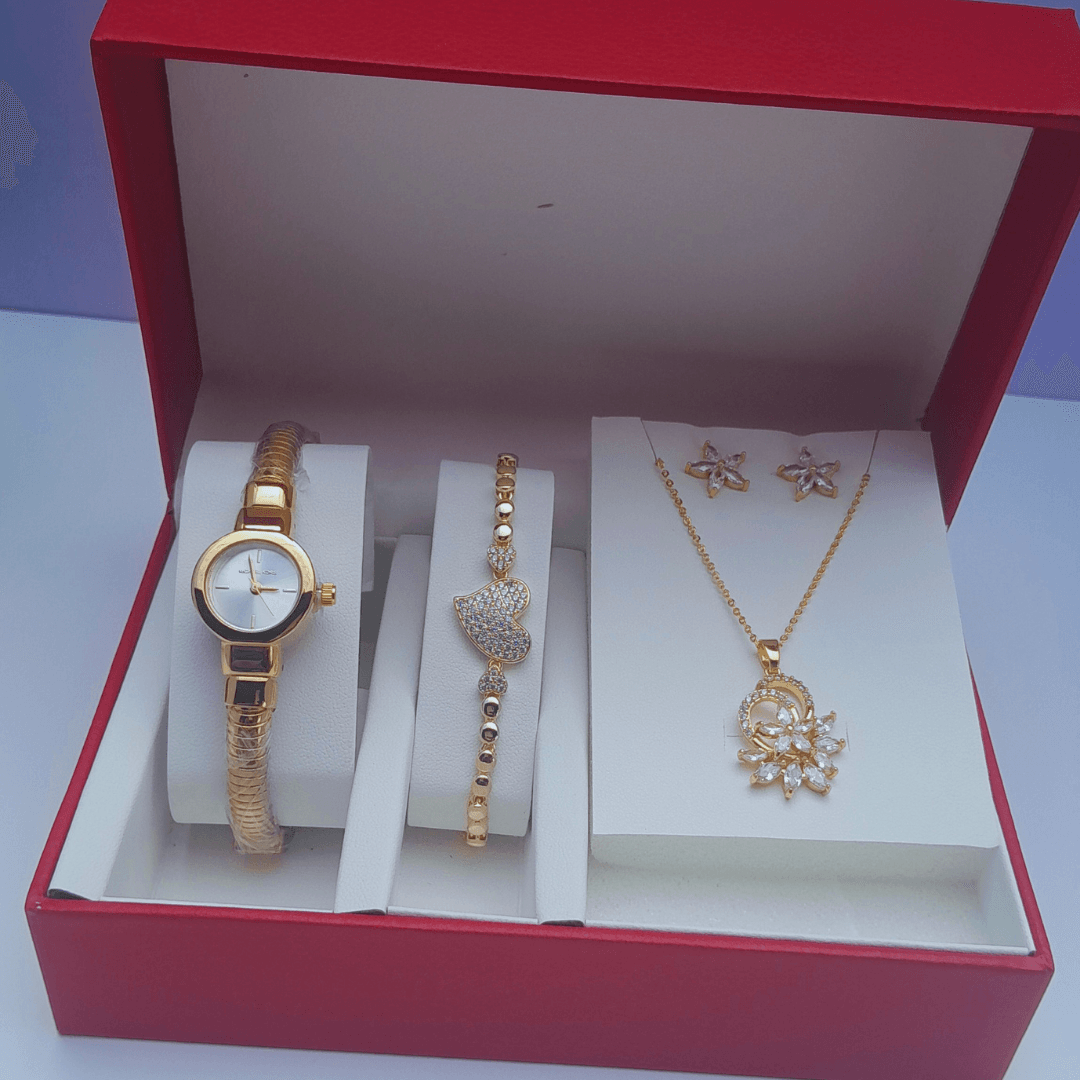 Designed for women who appreciate understated charm, the watch combines reliability with minimalist design. The bracelet and necklace offer gentle shimmer and are adjustable for comfort and style flexibility. The earrings provide a delicate sparkle, completing the ensemble with finesse.